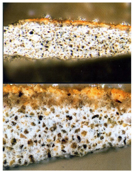 Stratigraphic studies of the paintings and archival searches reveal a new face of this building. The research was conducted under the CMP program (Conservation Management Plan—prepared by the authors of this article, among others)—a grant from The Getty Foundation under the “Keeping It Modern” program. According to the source materials, the architect intended to leave only the exterior part raw, while the interior was to be decorated with paintings, stained glass, and sculpture. Stratigraphic research has shown that the exterior walls were covered with a transparent yellowish color coating (Figure 15).