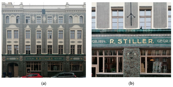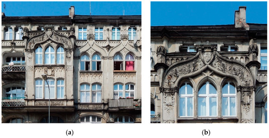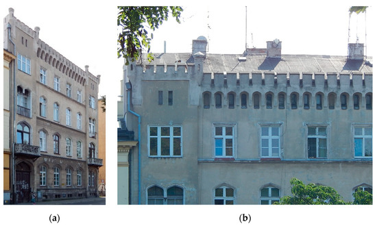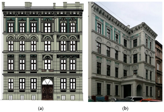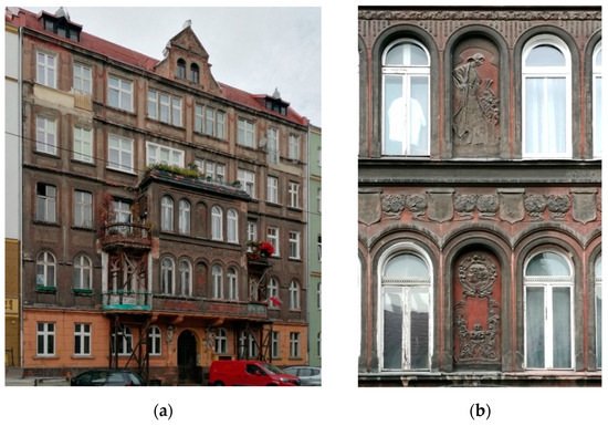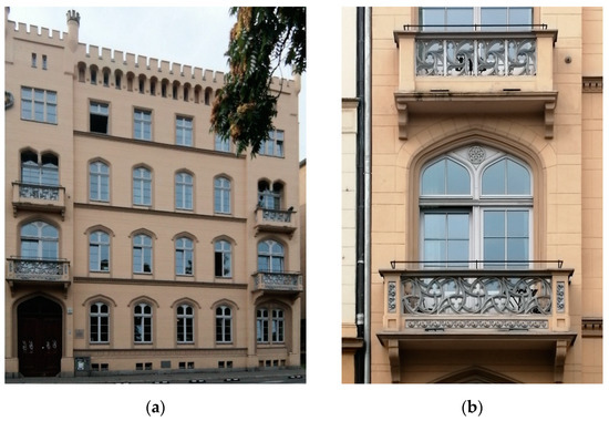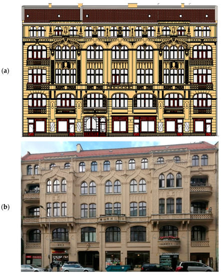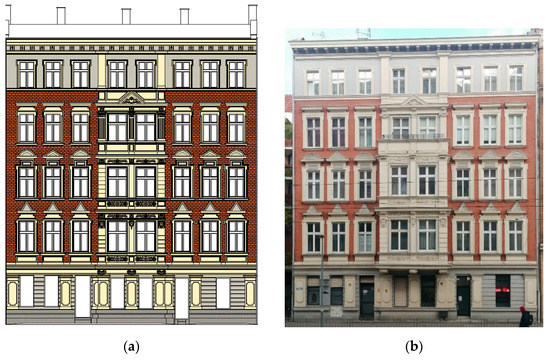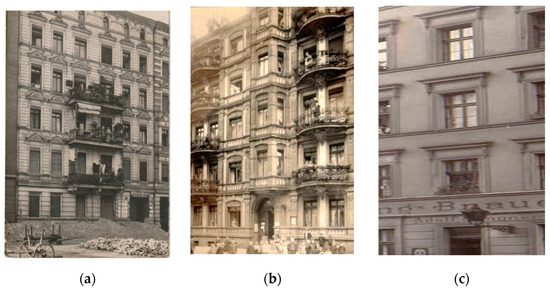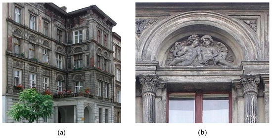 Mass construction of richly decorated tenement houses was made possible thanks to widespread catalogues, templates, and diagrams, and even prefabricated architectural details, plaster models, etc. (Figure 3) (Donauer and Reusch 2007). It seems that not only was mass-colored plaster used at that time, but also the technique of painting was used. Painting the façade surface was a simpler and cheaper construction technique.