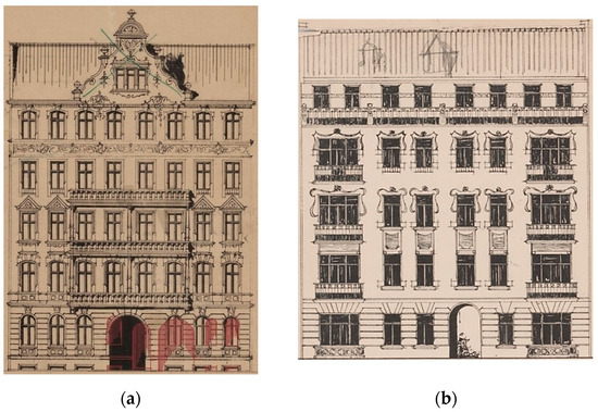 Archival façade projects of tenement houses in Wroclaw in the Neo-Renaissance (a) and Art Nouveau (b) styles (Collection of the Building Archive of the City of Wroclaw).