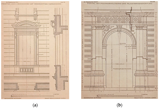 Archival boards of Neo-Renaissance architectural details. Details of window trim (a) and entrance door portal (b) (Brausewetter 1898).
