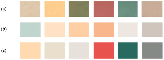 At the turn of the 19th and 20th centuries, in the Art Nouveau period, the colors of the façade gained more saturated tones again. It was a reaction to the dirty and faded colors of older buildings (Donauer and Reusch 2007). At that time, colors such as dark blue, dark green, purple, red, gold, etc., were very popular (Figure 4c). These colors were usually combined with pastel shades on large surfaces. This convention is represented, for example, by the renovation project of the tenement house on Kosciuszki St. 37, Wroclaw (2015).