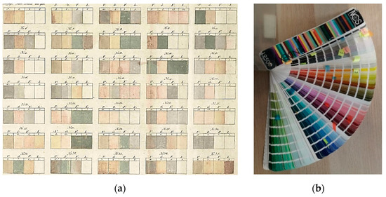 In the façade color design, the colors and their features should be precisely defined. Appropriate templates are helpful here. The first templates and color recommendations for the elevation were published at the end of the 18th century (Figure 6a) (Wojtysiak 2003). Currently, you can precisely choose any façade colors according to their numbers. The universal NCS—Natural Color System—template is often used (Figure 6b). The paint manufacturer’s color template offers a more precise selection of colors. The colors of varnish coatings are most often selected in the RAL system (painting, for example, of metal or wooden elements). Computer design of colored objects is possible thanks to the RGB system, which enables additive mixing of primary colors, red, yellow, blue, and black (Donauer and Reusch 2007).