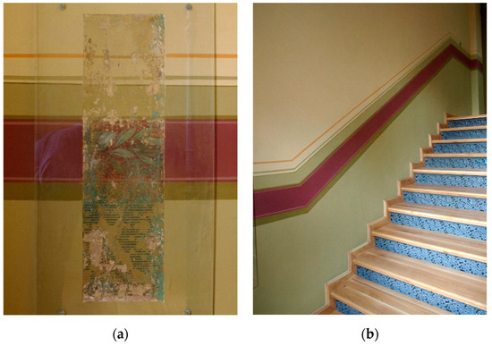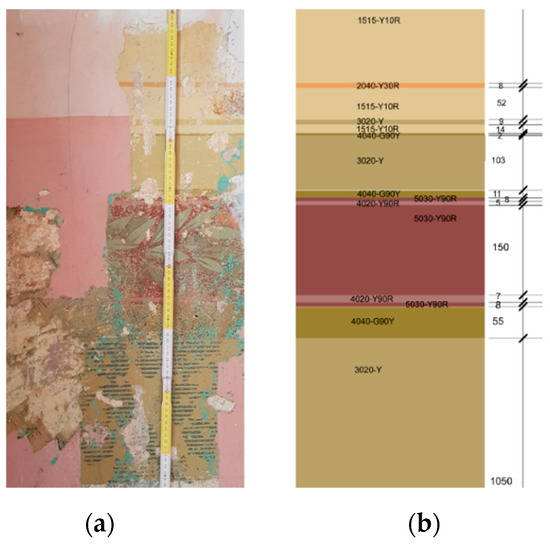 When the technical condition of the upper layers of wall painting is examined, the stratigraphy technique is used. Its purpose is to determine the order of occurrence of the material layers of the façade (Stratigraphic Studies 2021). Traces of paint layers from the period when the building was erected are considered “authentic”, “original” (Święcka 2017).