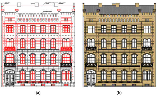 Stratigraphic studies showed the existence of the primal paint layer in an earthy hue (referring to the natural building material) (Wandrychowska 2014). The original color was similar to “Caparol Histolith Dunkler Ocker 20”. As a result of stratigraphic studies, comprehensive conservation work was recommended on the surfaces of flat walls, plaster and sandstone, architectural details, door and window joinery, and metal details (Figure 15a) (Nowakowski 2014b; Wandrychowska 2014). The ocher color was proposed on the elevation according to the “Caparol Histolith System, Dunkler Ocker 20” (Figure 15b). The original color of the windows could not be determined. The gray color of the windows (RAL 7040) was established after consultation swith the Monuments Conservator Office. The decision was made based on the experience gained after the renovation of other tenement houses in Wroclaw, built in a similar period.