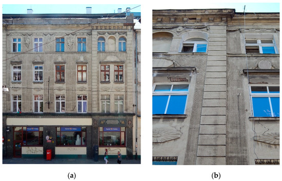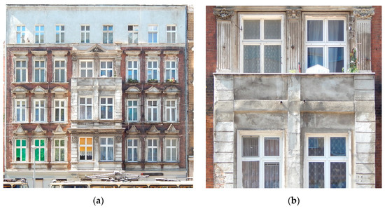 The tenement house, Grabiszynska St. 101, Wroclaw. Dirty elevation with damaged plaster and peeling paint (a). The oriel with damaged and uneven plaster and peeled paint. Architectural details in the Neo-Renaissance style were missing (b).