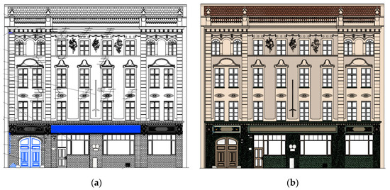 Tenement houses in the historical neo-style (Neo-Renaissance, Neo-Romanism, Neo-Gothic) gained expressive colors in the 1830–1850s. The colors were more saturated compared to the previous neoclassical style. Strong saturation and color contrast were perceived as synonyms of strength and power, and less saturation as synonyms of weakness and delicacy (Figure 4a) (Donauer and Reusch 2007). This convention is represented, that is, by the renovation project of the tenement house on Kniaziewicza St. 17 (2017).