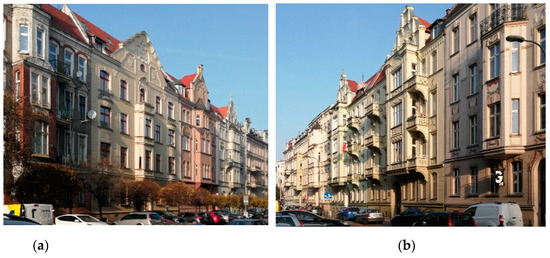 Most of the preserved buildings in Wroclaw date from the second half of the 19th and the beginning of the 20th century. Tenement houses were built mainly in eclectic, historical Neo-Renaissance style, and later in the Art Nouveau style (Figure 2). Other styles, such as Neo-Romanism, Neo-Gothic, and Tudor, were rarely represented. These styles corresponded to the aesthetic trends in architecture at that time. They are still clearly visible on preserved objects. Tenement houses were usually richly decorated. The ornaments were modeled on old architecture and art eras and styles. The decorations of some tenement houses even represented an eclectic combination of several styles. The eclectic style did not lead to the creation of new stylish forms of synthetic quality. The combined decorative elements and colors were not subject to constant selection criteria. They did not create a homogeneous whole in terms of style and color. This stylish solution is represented, that is, by the renovation project of the tenement house on Krasinskiego St. 21–23, Wroclaw (2015).