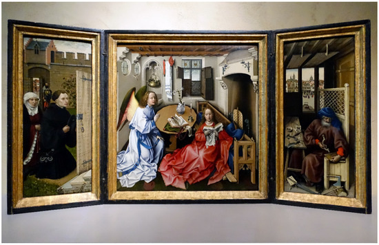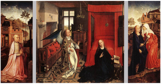 Rogier van der Weyden and workshop, Annunciation Triptych, ca. 1435–1440. Oil on oak; 89 × 36 cm (wings). Paris, Musée du Louvre (centre panel) and Torino, Galleria Sabauda (wings). © Wikipedia Commons, https://commons.wikimedia.org/wiki/File:Rogier_van_der_Weyden_-_Annunciation_Triptych_-_WGA25590.jpg (accessed on 30 October 2021). Image in the public domain.