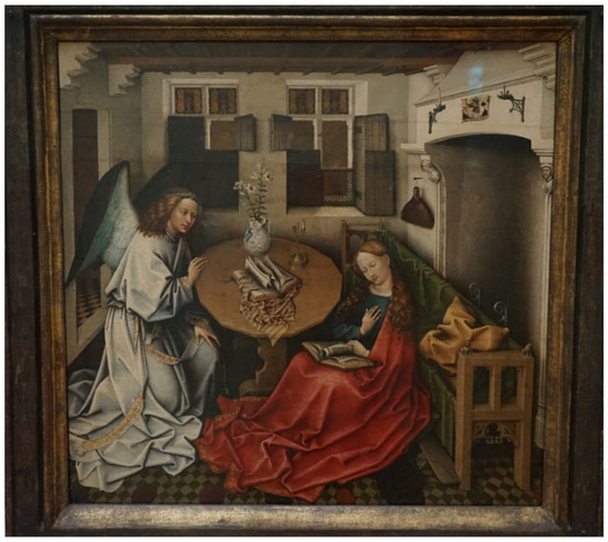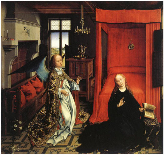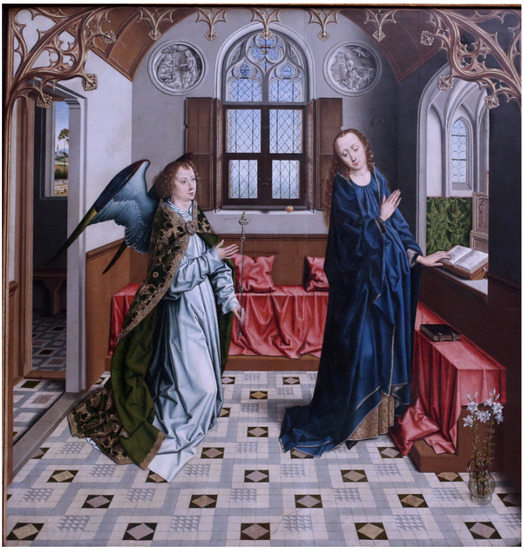 Rogier van der Weyden and workshop, Annunciation, ca. 1435–1440. Oil on oak, 86 × 93 cm. Paris, Musée du Louvre. © Wikipedia Commons, https://upload.wikimedia.org/wikipedia/commons/3/35/Rogier_van_der_Weyden_-_The_Annunciation_-_WGA25591.jpg (accessed on 29 October 2021).