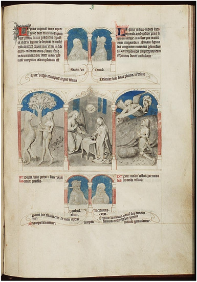 Master of Rambures, Biblia pauperum (Hesdin or Amiens), ca. 1450–1455. Parchment, 10.5 × 6.5 cm (left and right miniatures); 11 × 6 cm (centre miniature). Den Haag, Museum Meermanno-Westreenianum, ms 10 A 15, fol. 21r. © National Library of the Netherlands, https://manuscripts.kb.nl/zoom/BYVANCKB%3Amimi_mmw_10a15%3A021r (accessed on 30 October 2021). Image in the public domain.