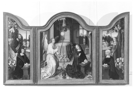 Moreover, the composition helped guide the viewer’s meditation. According to Falkenburg, thinking in terms of visual strategies contributes to explaining the supposed anomalies of the Merode Altarpiece (Falkenburg 2001, p. 11). For instance, while the Annunciation seems to take place in the donors’ home, as suggested by the presence of their coats of arms on the window, they remain outside. What the painting represents, Falkenburg suggests, is the aspiration of the donors’ souls to enter Mary’s house spiritually. This aspiration has not yet been realized, as indicated by the steps leading up to the house, which stand for an image of spiritual progression: meditation and prayer are the steps leading the soul into Mary’s house. Ingrid Falque has explored the complex spatial construction of the Merode Altarpiece in the frame of her analysis of a corpus of Flemish paintings including devotional portraits.26 The painter juxtaposed distinct physical and pictorial spaces to emphasize the gap between the saintly figures and the devotees (Falque 2019, p. 109). Indeed, the view of the sky from the window of Mary’s room is not consistent with the setting of the left wing. Similarly, in the Du Quesnoy-Van der Tommen Triptych (Figure 11), the family of donors are depicted in a landscape on the wings, which seems disconnected from the interior shown on the centre panel. However, the window at the back of Mary’s bedroom shows the same rural landscape through a half-open shutter, so that the whole composition retains a sense of unity. As remarked by Ingrid Falque, “By situating the devotees outside the house of the Virgin, the painter seems to imply that the sacred place in which the Annunciation takes place is not (yet) accessible to them” (Falque 2019, pp. 77–78).