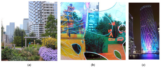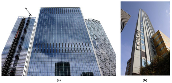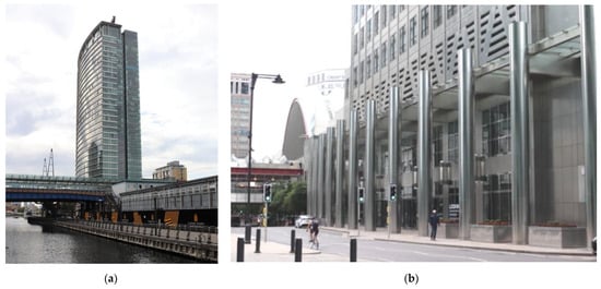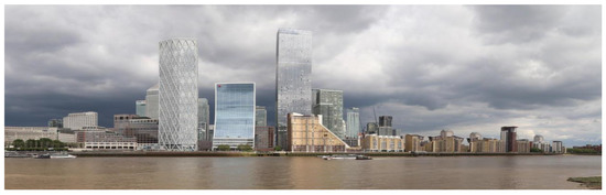 As presented in Table A1, the office towers were designed as a single slick form of gridded skins with minimum or large scale ornamentation. The majority of buildings from that period are composed along with the horizontal composition: The top–middle–base. Windows are part of the elevations’ skin, without formal recognition through detail. Projecting mullions to curtain facades relate to the whole facades rather than individual openings. Architects employed to design Canary Wharf towers were key global players of that era: Cesar Pelli Associates, KPF Associates and Foster & Partners. They had already been experienced in designing tall buildings in the USA and Asia; therefore, some of their buildings have clear inspirations in an international style, and all of them represent a rather conservative approach to the architecture of skyscrapers. The form of the buildings is predominantly cuboid on rectangular footprint, architectural detailing is of a large scale, the colour palette is highly reflective and includes glass with a variety of shades of blue, silver of stainless steel, earthy tones of natural stone and subtle black metal work.