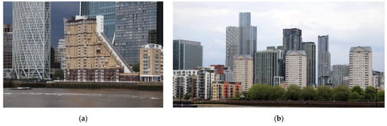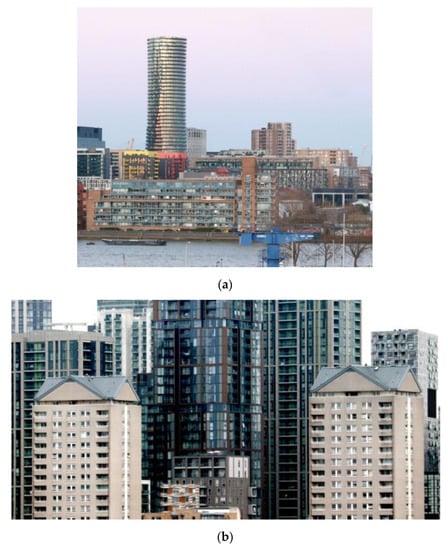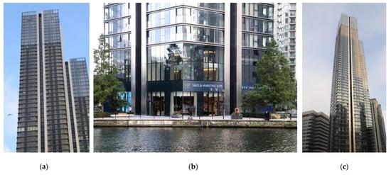 Residential buildings on the Isle of Dogs were delivered at the beginning of the radical regeneration of London’s docklands. Buildings were predominantly of a low to middle height, and also included terraced and semi-detached houses. There were five large buildings constructed in C20 in this area, four of them were considered in this study (see Table A2 in Appendix A). They represent a modest post-modern aesthetic.
