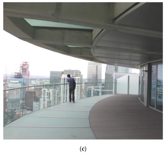 Sunshine as a deconstructing factor, Baltimore Wharf example. (a) Silhouette of the tower in good lighting conditions (2019), (b) Close up of the tower in poor lighting conditions (2020); (c) Detail of terraces in poor lighting conditions (2019).