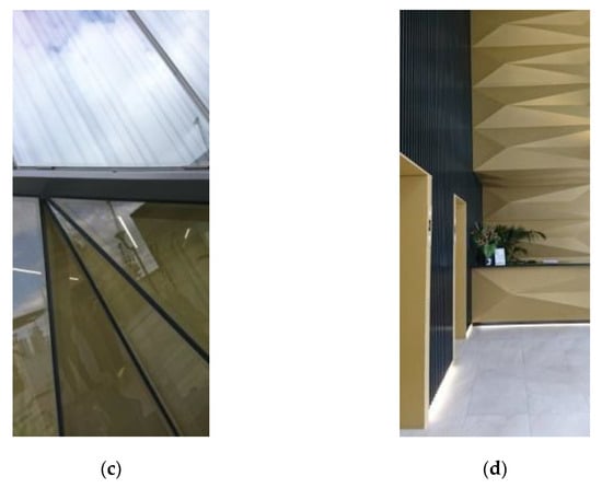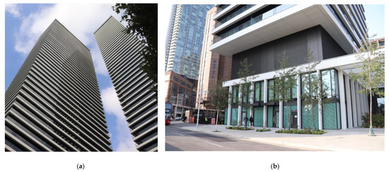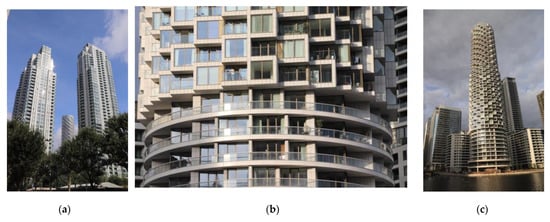 Glass buildings like Newfoundland by Hudson Cherry Lee Architects or The Madison by Make are additionally wrapped up with the regular pattern of superstructure diaframe (Figure 7 and Figure 8a) and projecting white undulating vertical fins throughout the whole height of the building. Bright colours of those patterns stand out on sunny days in particular.