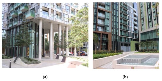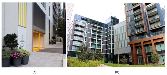 Colour applied to create formal illusions, the Wardian. (a) Regular rhythm of elevations with depth of balconies amplified by dark colour soffits (2020); (b) The entrance area visually disjointed from the main mass of the building through the dark colour louvers wrapping the service level (2020).