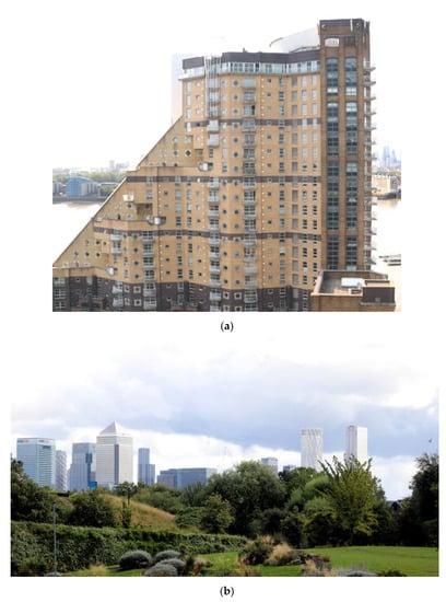 The historic views of Canary Wharf office towers. (a) Canary Wharf’s skyline viewed from the south, Maritime Greenwich World Heritage Site (2007); (b) Canary Wharf’s skyline viewed from the north, Poplar DLR station (2017).