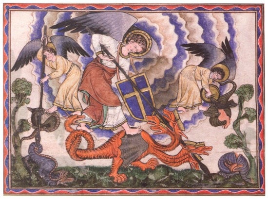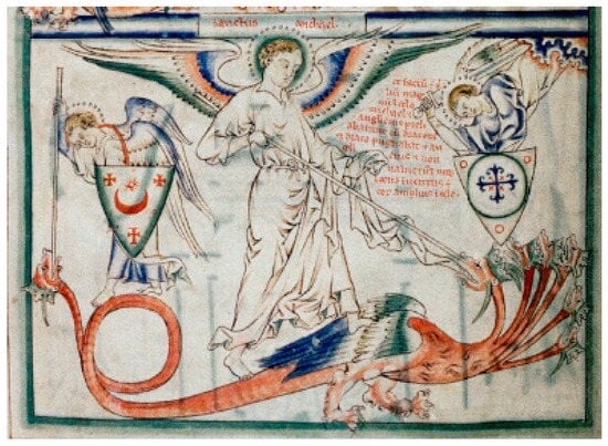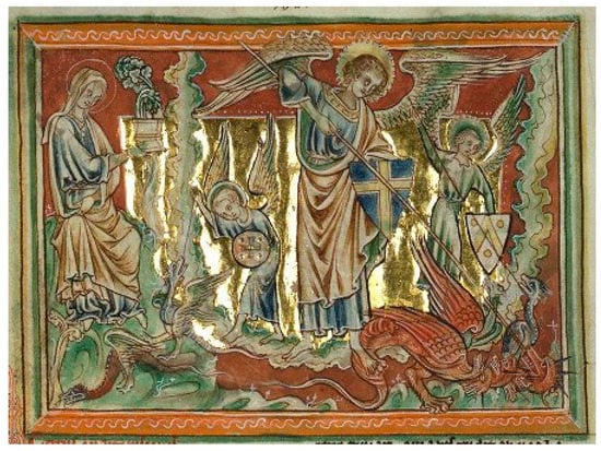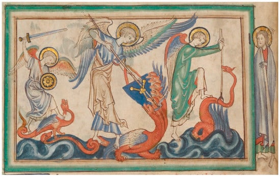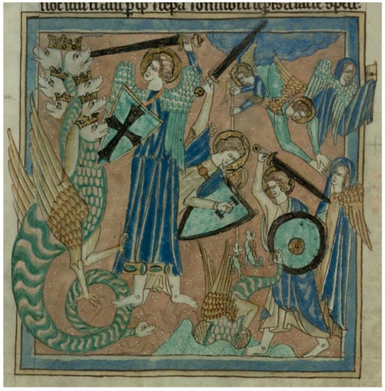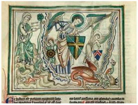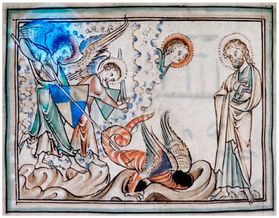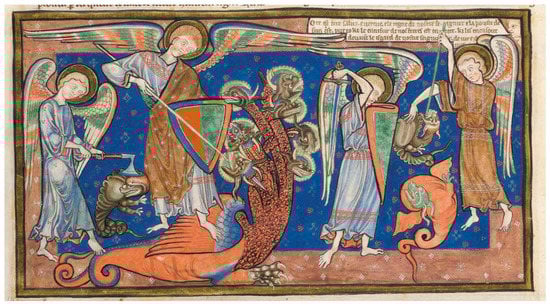 The identification of subsidiary figures is less problematic in case of the second subgroup (3.2) of images highlighting the result of the battle. War in Heaven compositions in the Cambrai (Figure 8), Lambeth (Figure 9), Gulbenkian, and Abingdon (Figure 10) Apocalypses differ only in smaller details, such as weapons missing from the hands of angels in the latest member of the subgroup, the perhaps unfinished Abingdon composition. The heavenly sphere, delineated again with a curlicue line separating at least half of the pictorial space, appears on the right in these manuscripts. Now, three angels are visible in Heaven, the larger Saint Michael in the middle is endowed with an unusual three pairs of wings in the Abingdon Apocalypse. Each angel is duelling one fallen dragon, but the differences between the dragon figures render it unlikely that the same dragon would be represented multiple times in a narrative sequence in these images.