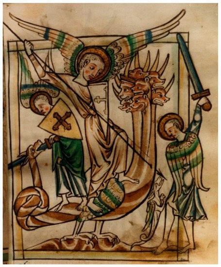 Taking into consideration that, in all compositions examined here, only one, the largest, dragon is equipped with a tail-head, this similarity makes one wonder if the same dragon is represented twice. Perhaps we witness a narrative: the dragon first being fought and finally cast down. However, the angels fighting the two dragon figures are not the same: they differ in their size, clothing, the colour of the wings, and even in their weapons. The left dragon has only one head without horns, as opposed to the six horned heads of the dragon under Saint Michael’s feet. What we witness, therefore, is either three different dragons or two dragons fought by three different angels. In the former scenario, the equal number of angels and dragons would be another similarity with the Trinity Apocalypse (1.3). In the latter case, the three angels vs. two dragons distribution would be reminiscent of the Eton-Lambeth 434 subgroup (1.2) above, but unique among the compositions examined so far, with a narrative of the events depicted in one composition, which fuses the War in Heaven with the Fall of Satan.