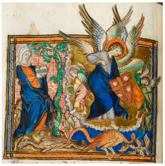 Every single dragon is depicted outside Heaven. Similarly to the Tanner Apocalypse, Satan has already fallen in these images, and victory has been achieved. The texts accompanying the images also merge the two scenes as the manuscripts quote Revelations 12:7-12 and the relevant section of the Berengaudus commentary. Outside Heaven, the fallen dragons share the space of a woman sitting under a tree and reading a book on the far left, who shows little concern for the heated battle. These compositions, therefore, also fuse the War in Heaven and Fall of Satan with the Woman in the Wilderness scene, immediately preceding the War in Heaven episode in Revelations.
