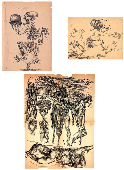 Mallary’s eventual involvement with the computer was the consequence of his long-standing interest in art and technology, from the very beginning of his career in the mid-1930s. From 1938, he studied in Mexico City at the Escuela de las Artes Libro for a year and again from 1942 to 1943 at the Academia de San Carlos. Surviving drawings (Figure 1) from this period show anti-war and anti-fascist sentiments. Skeletal, cadaverous, and grotesque figures, some wearing soldiers’ helmets and some with swastikas, exude existential angst. The artist, taking his cue about socialist politics from the Mexican mural painters, later explained, ‘My first enthusiasm was the Mexican school of mural painting and my model was David Alfaro Siqueiros’ (Mallary 1976, p. 4).