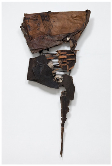 The huge survey exhibition The Art of Assemblage at MoMA in 1961 included numerous artists among them many works by Schwitters. Mallary’s Jouster (Figure 5) was hung next to Robert Rauschenberg’s now-famous Canyon, 1959, in MoMA. Robert Slifkin has recently argued that the signs of ‘violent destruction and ruinous decay’ seen in works such as In Flight and Jouster, ‘were directly informed by the precarious circumstances of the postatomic age in which they were produced’. They both ‘imagine the possible demolition of the urban environment and serve as cautionary prophecies against such a fate’ (Slifkin 2019, p. 60). Schwitters had written similarly of this, in reference to World War I: ‘In the war things were in terrible turmoil. What I had learned at the academy was of no use to me […] Everything had broken down […] and new things had to be made out of the fragments’ (Elderfield 1985, p. 12).