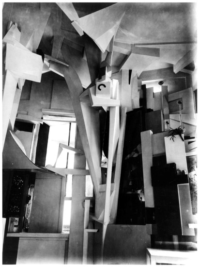 The viewer becomes a participant, progressing through the various grotto and cave-like spaces of the Merzbau, discovering different vistas, opening secret doors and cupboards, thus incorporating an element of interactivity. Schwitters explained he was not ‘constructing interiors for people to live in, […] I am building an abstract sculpture into which people can go’. For him, this was a ‘composition without boundaries, each individual part is at the same time a frame for the neighboring parts, all parts are mutually interdependent’ (Elderfield 1985, p. 156).