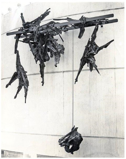 Mallary’s tuxedo works take this further, held together and formed by impregnated resin, the suits becoming the sculptural medium itself. The empty clothing is suggestive of the human body, or perhaps more specifically, ‘an absent occupant’ (Andrews 1988, p. 139). This is seen, for example, in the monumental 1964 work Cliffhangers (Figure 7), which engages with its architectural setting—the Modernist exterior of the New York State Pavilion, designed by Philip Johnson, for the World’s Fair at Flushing Meadows. The falling ‘figures’ (stiffened tuxedos), seem to prefigure the self-destruction of humanity (Slifkin 2019). Mallary explained, ‘it has to do with contemporary man as assailed, harassed, confused, frustrated, befuddled, desperate, and hysterical. As lonely, isolated, afraid, and alienated’ (Mallary 1963a).