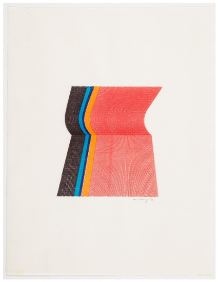 Robert Mallary, Colour Plotter Graphic, 1972. 8.6 × 11 ins. Image courtesy Mayor Gallery London. Made on the Amherst College IBM system using artist-designed program GRAF/D written in FORTRAN IV. The program stops while the different coloured pens are changed by hand.