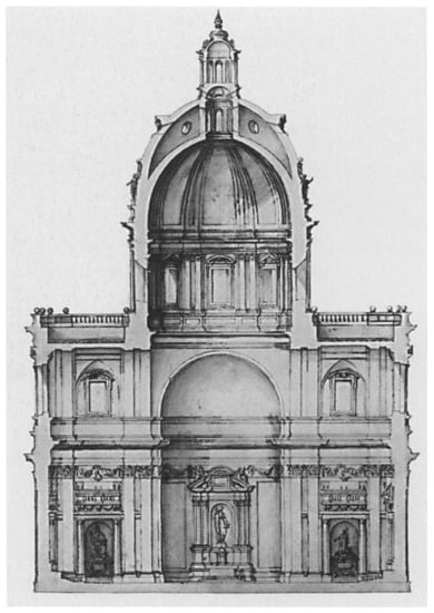 Compared to the drawing preserved in the Vatican, that of the Albertina is instead more decorated, always with a lantern on the dome, but without the obelisk (Figure 5b). This drawing is probably Grassi’s last project (1650) for the dome of St. Ignatius and slightly precedes the death of its author. Cardinal Ludovico Ludovisi, the great financier of the work, was dead by 1632, and his successor, his brother Niccolò, had not found sufficient funds for the construction of the dome.