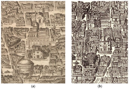 (a) Antonio Tempesta, Plan of the City of Rome ed. 1645 by Giovanni Domenico de Rossi, The Metropolitan Museum Edward Pearce Casey Fund, 1983 (Accession Number: 1983.1027(1–12)) and (b) Federico Agnelli, Map of Rome 1666, Reprinted with permission from Ref. (). Copyright 1962—2022 Istituto Nazionale di Studi Romani.