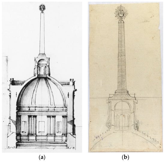 Galileo’s death in 1642 may have played a role in the presentation of the second design of the dome in 1650. Having abandoned the idea of a double-layered dome, heavier, more difficult to build and expensive, the Jesuit turned to a more typical single dome, cheaper, and incorporated in a tiburio, as shown in Figure 4a, inspired by the experiments of Francesco Capriani da Volterra. Grassi’s dome—tiburio, which precedes Borromini’s dome of Sant’Andrea delle Fratte by a few years, is however characterized by the presence on the lantern of a spectacular “solar needle”, an obelisk, completed with the Jesuit monogram (Albertina AZRom495), about fifty palms high, twice that of the obelisk Macuteo, which today can be admired in Piazza della Rotonda, in front of the Pantheon, but which at the time was raised in Piazza San Macuto, a few meters away from the entrance of St.Ignatius (Figure 4b).