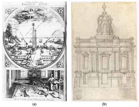 Connors () traces the second project back to one of the engravings in Scheiner’s Jesuit astronomical text, the Rosa Ursina (1626–1630), which was one of the key treatises in the controversy with Galileo and contains one of the largest collections of observations on the position of sunspots, which Scheiner mistakenly believed to be small planets orbiting Mercury. Scheiner’s “Astronomical Square” (Figure 5a) is an engraving divided into two parts, an upper and a lower one. In the lower part, two Jesuits are intent on observing the shadow cast by the sun on a sheet of paper through a refracting helioscope. In the upper part, however, it is possible to admire the actual Astronomical Piazza, an open space composed of two obelisks, one of which is surmounted by the radiant and flaming emblem, as in Grassi’s drawings kept at the Albertina and the Vatican Library.