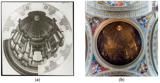 (a) Andrea Pozzo, 1693, Drawing of a dome, from ‘Perspectiva pictorum et architectorum’, and (b) Andrea Pozzo, 1685, Fake dome of St Ignatius, By Jean-Christophe Benoist—Own work, CC BY 2.5, https://commons.wikimedia.org/w/index.php?curid=2553801. Accessed on 30 March 2022.