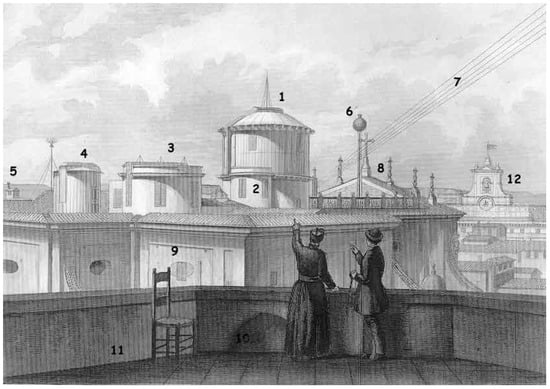 As already mentioned, the Jesuit order was officially suppressed by the Holy See in 1773, after the national expulsions that had begun in 1759, and re-instituted only in 1814; only in 1824 the Collegio Romano returned to the Jesuits. In this period the activity of the College was certainly not suppressed and a non-Jesuit priest, Giuseppe Calandrelli (), part of the secular clergy, was charged with setting up the first nucleus of the observatory of the Collegio Romano () in a small quadrangular tower located on the facade of the college, and from 1781 this was in charge of taking, according to international standards, systematic meteorological surveys (). When the College was returned to the Jesuits and the professors replaced, the Jesuits made an exception by keeping Calandrelli who, in solidarity with his purged colleagues, resigned. In 1850 Brother Angelo Secchi, a Jesuit and sunspot expert, became director of the observatory. He modernized the observatory, building the new structures that can still be seen today on the roof instead of the dome. It was in this year that Grassi’s original idea of a dome/square/observatory was realized, although not in the form envisaged by the Savonese Jesuit. From this period are the famous engravings with the two figures on the middle terrace of the Calandrelli Tower (Figure 7) observing astronomical installations, and that with the section of the observatory (). After the annexation of Rome to the Kingdom of Italy in 1870, and the death of Angelo Secchi in 1878, the observatory was entrusted for the first time to a secular trustee, Pietro Tacchini.