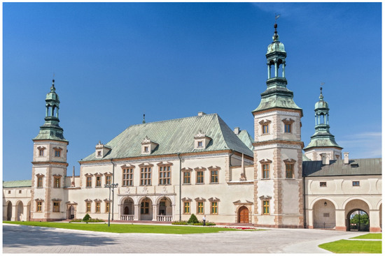 Trevano can thus be credited with introducing new architectural themes to the Wawel residence, and the design and construction of the north façade of the castle facing the city center, with two residential towers placed in the corners (Figure 1) (Tomkowicz 1908, pp. 345–48; Bochnak 1948, pp. 122–23; Szablowski 1965; Kuczman 1994, pp. 163–66)5. This should be acknowledged as an extraordinary achievement given the fact that Wawel’s north façade would become a model for many other residences in Poland (e.g., Ujazdowski Castle in Warsaw and the Palace of the Krakow Bishops in Kielce; see Figure 2).