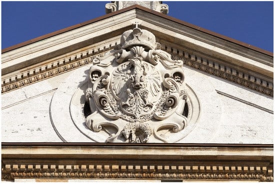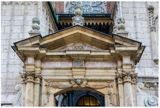 The church was erected along the Royal Route, the capital’s representative road serving as a suitable background to coronations, parades, and other ceremonies. Although construction began at the end of the 16th century, it was probably around 1610 that Giovanni Battista Trevano, already styled the Royal Architect, took over the supervision of the construction activities, which lasted at least until 1619. He had the building’s construction reinforced. During that period, the church’s dome was erected, the stone articulation of the façade was built, and the decoration of the church interiors began. The Church of Saints Peter and Paul remains one of the masterpieces of Baroque art in Poland. It is an example of the early transition of new patterns inflowing to Krakow directly from Italy (Bochnak 1948, pp. 89–113; Małkiewicz 1967; Małkiewicz 1997).