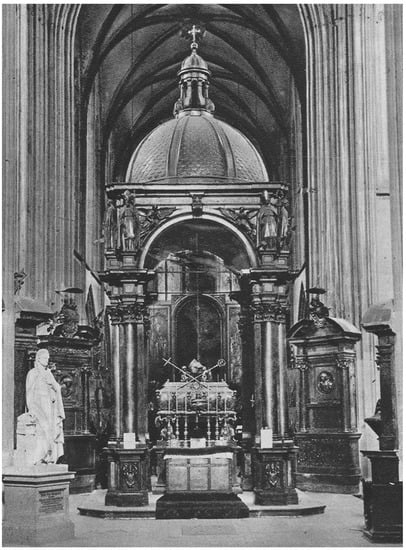 He is also believed to have erected the canopy chapel over the tomb of Poland–Lithuania’s patron, St. Stanislaus, inside the cathedral (1624–1629). The work was funded by the bishop of Krakow, Marcin Szyszkowski (Figure 6), who later commissioned Trevano to create his tombstone (Bochnak 1948, pp. 114–20; Szablowski 1965; Rożek 1980, pp. 47, 74, 104).