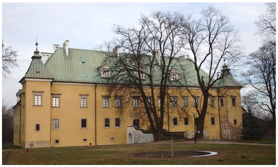 Stylistic analysis and Trevano’s relationship with the Szyszkowski family are two factors that allow for attributing the rebuilding works in the Gothic Renaissance castle located in the village of Spytkowice, outside Krakow, where an early Baroque palace was most likely erected between 1622–1633 (Figure 7), to him. It was a two-story three-winged edifice with a pillared gallery closed from the north by a screen façade (Holcerowa 1985, pp. 8–15, 54–58, 64–67).