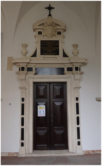 Another not fully discovered chapter of Trevano’s biography is the social and financial network he built in Poland. Shortly after his arrival in Krakow, he took up projects in collaboration with other Italian artists living in Poland: builder Giovanni Battista Petrini and Milanese sculptor Ambrogio Meacci. Trevano guarded the interests of his own brothers, the Venetian merchants Paolo and Giovanni Maria, in Krakow. He maintained a closer relationship with other immigrants from Ticino area (Francesco Mucino/Mocino) and his native Lugano (Giovanni Reitino, Sebastiano Sala). Trevano was often nominated as the executor of last will by foreigners who died in Krakow, some of whom confided their children to Trevano’s care (Tomkowicz 1912, pp. 129–33; Karpowicz 1994, pp. 48–50; Kuczman 1994, pp. 168–74; Karpowicz 2013, pp. 9–31). The artist was a member of the Confraternity of St. John the Baptist (Confraternita di San Giovanni Battista della Nazione Italiana di Cracovia), a religious society that had been founded in the 16th century in Krakow, bringing together local Italians (Tomkowicz 1900, p. 11). The confraternity owned a chapel in the Church of St. Francis and drew profits from its own estates as well as testamentary dispositions received. Its members included merchants, bankers, craftsmen, and artists. The organization was not merely a religious society, however: it served as an Italian community center in Krakow aiming to support Italians already living in the city or those arriving and to facilitate their career launch. The confraternity’s chapel retained its original portal funded by Simone Mutti, was mentioned above (Figure 9). This work can also be attributed to Giovanni Battista Trevano (Rożek 1977, pp. 111–15), which only reaffirms his strong ties with the Italian community in Krakow.