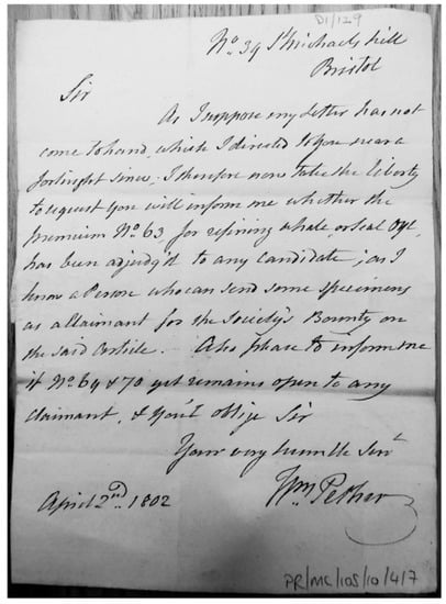 - Pether, William. 1801. Letter from William Pether about Refining Whale Oil. April 2. Bristol: Royal Society of Arts, Manufactures and Commerce Archives. [Google Scholar]