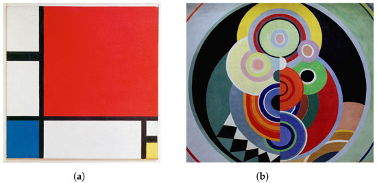 Example works of abstract Cubism and Orphism. (a) Piet Mondrian, 1930: “Composition II in Red, Blue, and Yellow”; (b) Robert Delaunay, 1938: “Paris Rythme” (Photo by Jean Louis Mazieres 1938).