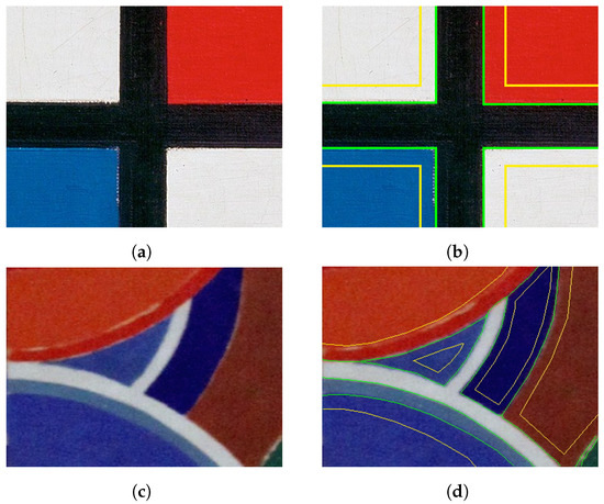 Sections of Mondrians and Delaunays paintings with boundaries highlighted. (a) Section of Mondrian’s painting from Figure 1a showing an area with multiple straight region boundaries; (b) boundaries marked (green: region boundary, yellow: inside/border region); (c) section of Delaunays Painting from Figure 1b showing an area with round boundaries between regions; (d) boundaries marked as above.