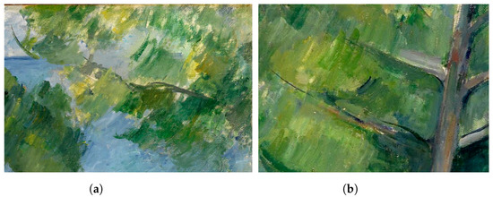Sections of “View of the Sea at L’Estaque”. (a) Part of a tree with gestural strokes; (b) sketched branch structure in a gestural tree.