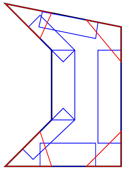 A polygon with constrained regions highlighted. Red corner areas are on two sides, blue side areas are constrained on only one.
