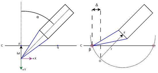 We assume the robot TCP is located at O, which we assume to be the origin for the following computations. First, we find the brush hair fulcrum point from polar coordinates: