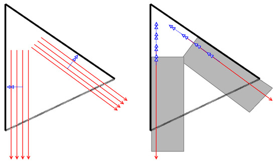 Strategy for the realization of corners. Left: in the first phase, move the strokes closer to the sides until we find a working suitable distance. Right: in the second phase, the found strokes are moved towards the tip until the region is properly filled. The gray area has already been covered in phase 1.