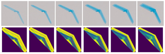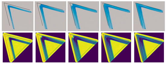 TSCR paint progression for a 30-degree corner. More tolerance is given at the tip since the tool cannot reach into it fully without violating the other constraining side. Top row: feedback images with no annotation. Bottom row: difference images with annotated goal and measurement lines. In the first two images, the strokes are moved from the inside towards the goal lines. Once these have been reached, the strokes are moved towards the tip, which fills it in.