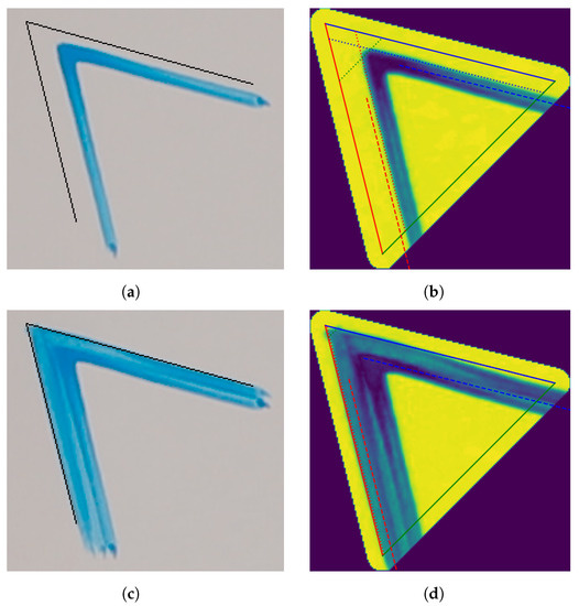 Progression of painting a corner using a TSCR. The left column shows the feedback images and the right column the difference images with measured corners indicated. The first two figures show the canvas state after the first step while the last two are taken five strokes later once the process had terminated. Note how the placed strokes were planned equidistant to the constraining sides, but the placed strokes are much closer on the right. This shows that brush deviation must be handled via optical feedback. (a) Initial painting of a corner with different distances despite paths being planned equidistant from goal sides; (b) measurement of initial strokes: the dotted lines represent the distance from the left edge (red), right edge (blue), and the tip (green). The dashed lines show the next planned corrective strokes; (c) finished corner with minimal overpainting of the target line. Only the unconstrained side is violated; (d) the final result: the painted regions are found to coincide with the target edges. The tip has been fully realized. This terminated the corner painting procedure.
