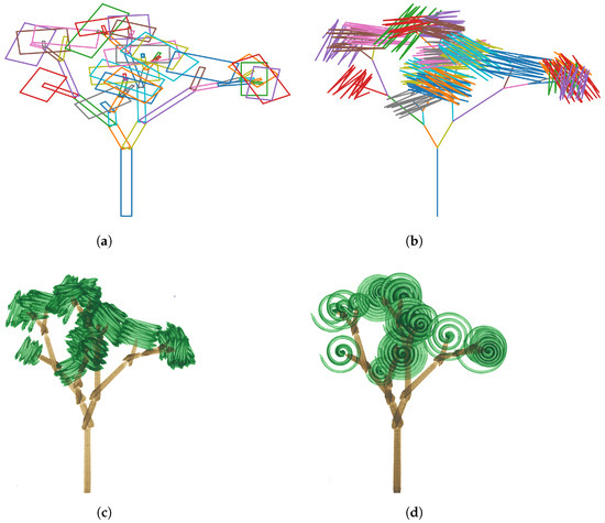 Figure 15 shows a basic fractal tree, painted using gestural techniques. While from a technical perspective this is not very noteworthy, offering such primitives to users of robotic painting systems is important. First, more abstract handling of the painting process hides details of SBR from users. Secondly, the ability to give more vague instructions over always requiring precise stroke commands makes the system more approachable and replicates some of the vagueness inherent to painting as discussed in Section 1.1. Finally, it allows for simplified automatic paint planning, as unimportant regions can be marked for rough gestural infill. Generating synthetic images, such as the shown trees also becomes easier. In this case, a simple fractal tree was generated as a set of boxes representing foliage and branches (Figure 15a). Foliage boxes were replaced with zigzag-like strokes, resembling those of Cézanne in Figure 5. The resulting leave structure in Figure 15c is somewhat similar. Figure 15d shows the same tree structure painted with spiral gestures instead of zigzags.